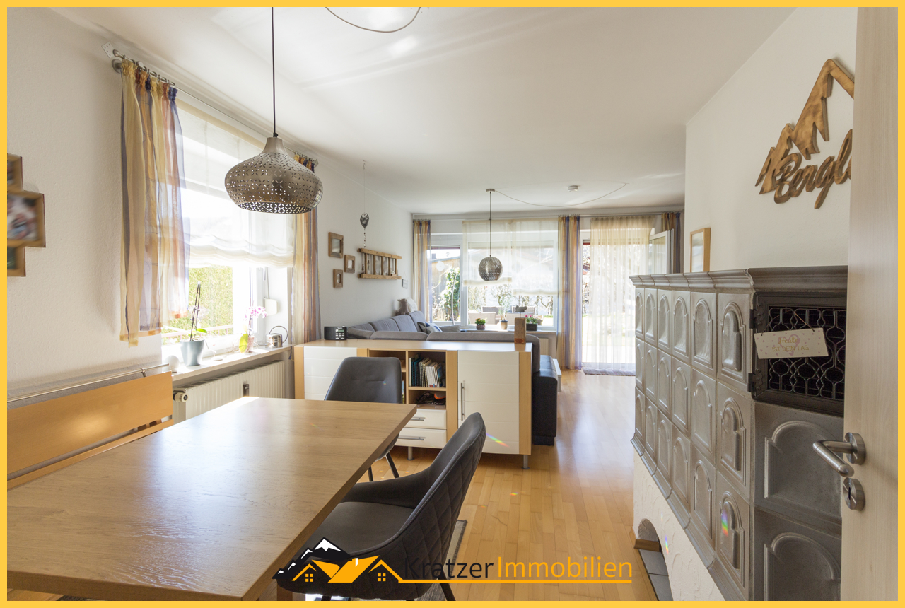 Der Wohn- und Essbereich besticht durch viel Tageslicht und direkten Zugang zur sonnigen Westterrasse und zum Garten. Ein idealer Raum für gemütliche Stunden mit angenehmer Wärme vom Kachelofen.