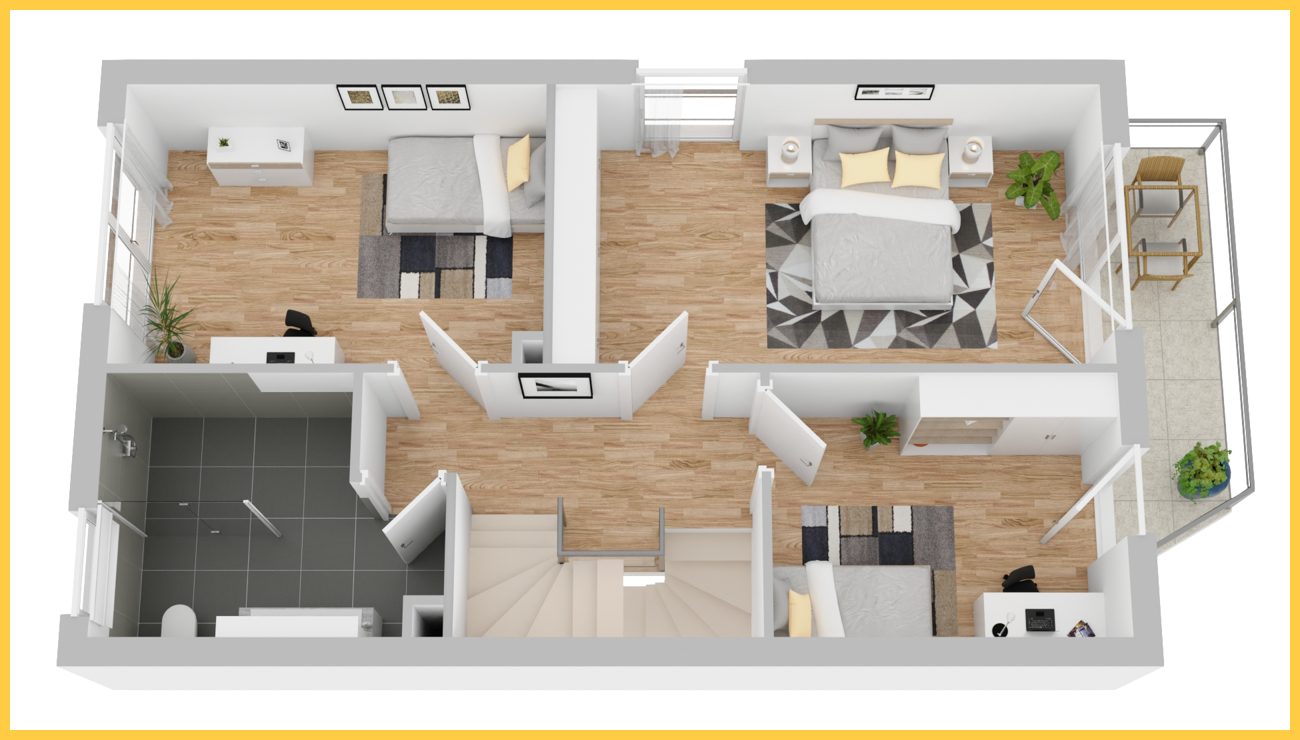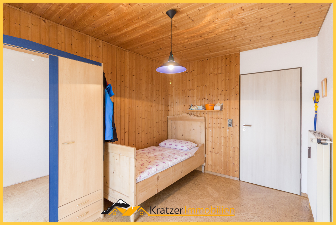 Im Obergeschoss des Hauses befinden sich drei Schlafzimmer, darunter das Elternschlafzimmer sowie 2 Kinderzimmer. Das Schlafzimmer und ein Kinderzimmer haben einen Zugang zum gemeinsamen, sonnigen West-Balkon. Ein wunderbarer Rückzugsort im Freien.
